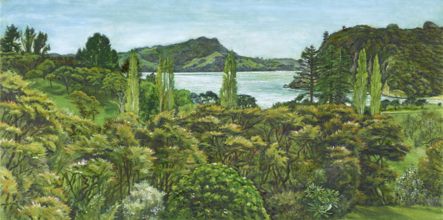 She painted two at Whangamata over January and early February. Over March to June she painted the two at Tawharanui. In October, she finished the one of Flaxmill Bay (which she had started a couple of years earlier - which posed a challenge, because the kanuka in the foreground had grown considerably).